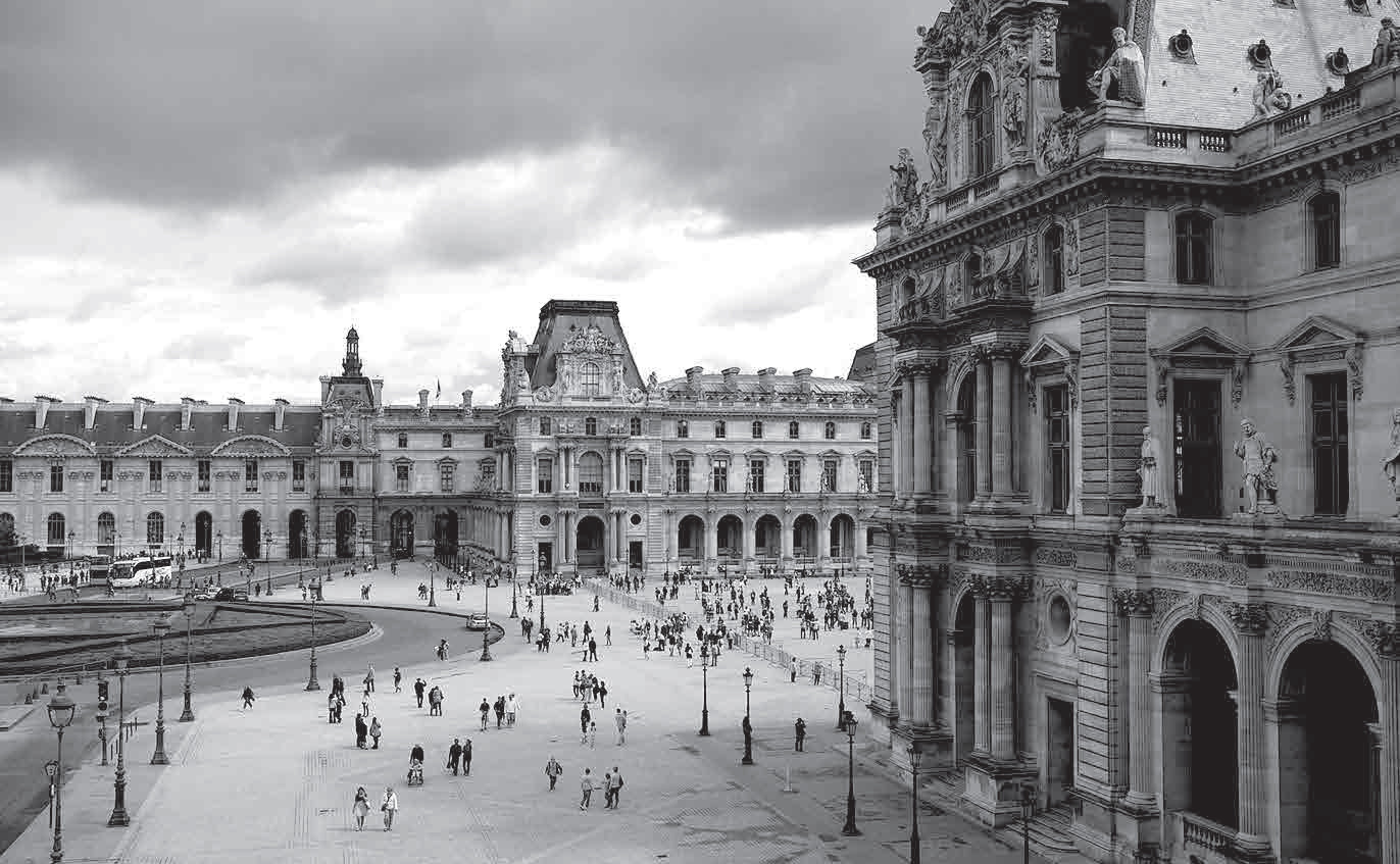 История Лувра восходит еще к Средним векам. На рубеже XII—XIII веков король Филипп II Август (1165—1223) решил возвести здесь замок с башней. На протяжении многих столетий французские монархи всё перестраивали это здание. Свою нынешнюю форму Лувр обрел лишь в XVI веке. Отныне его стиль определял величественный, строгий фасад, созданный архитектором Пьером Леско (1510—1578) по заказу короля Франциска I (1494—1547). Центральная часть Лувра представляет собой громадное каре, к которому по бокам примыкают два прямоугольных крыла с внутренними двориками посредине. Сегодня эту часть дворца занимает музей. При императоре Наполеоне I (1769—1821) была построена площадь Каррузель и сооружена малая Триумфальная арка, служившая парадным въездом в музей. За ней разбит сад Тюильри, расположившийся на месте сгоревшего дворца. Теперь здесь находится целый комплекс магазинов и галерей.