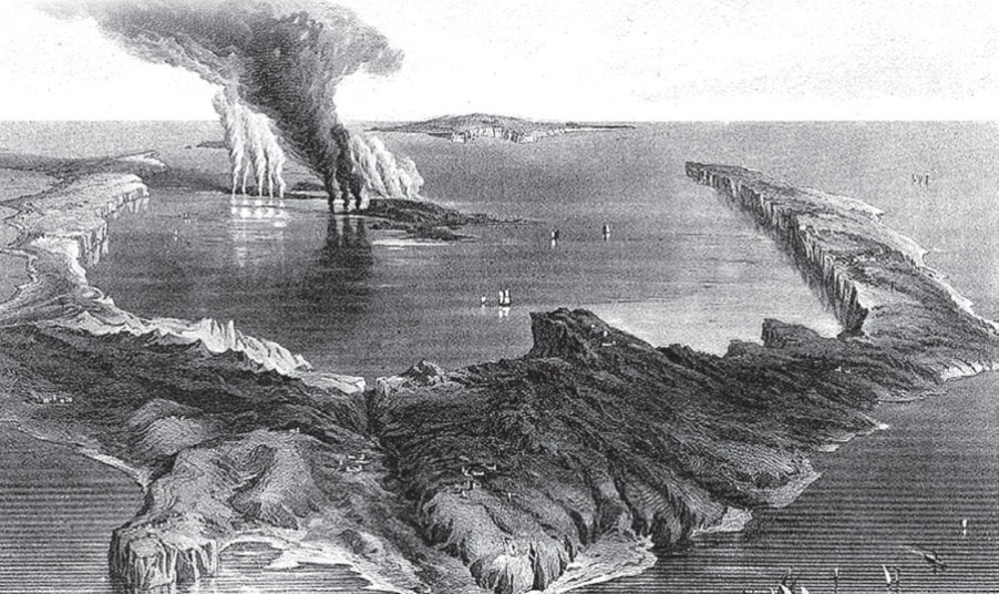 Стены вулкана обвалились. Образовалась котловина – кальдера. В эту пустоту хлынуло море. «Достигнув дна полости, – писал Галанопулос, – вода мгновенно ринулась вспять». Вверх взметнулся столп воды, возникла громадная волна цунами, устремившаяся вдаль, разрушая и затапливая всё на пути.