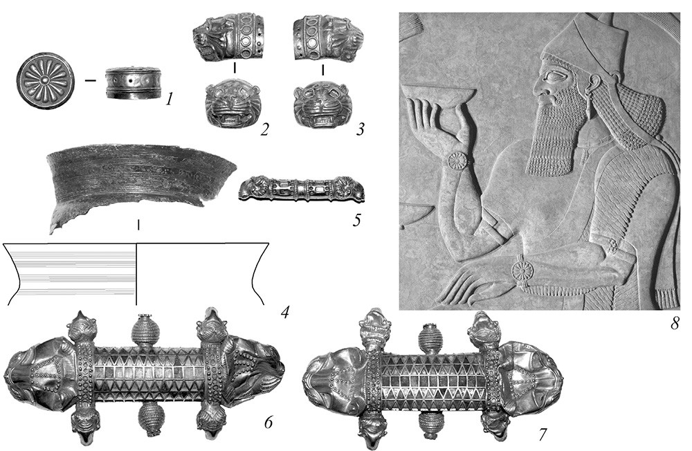 Скифы упоминаются в ассирийских хрониках на 50 лет позже киммерийцев, в 70-х годах VII века до н. э. в контексте нападений на восточные границы Ассирии, когда они выступали вместе с мидийцами. Вождем их был Ишпакай, который, вероятно, был убит в ходе этих баталий. Его наследник Партатуа возглавил скифов около 673 года до н. э. и был титулован как «царь скифов». Могущество его возросло настолько, что среди клинописных документов есть запросы к оракулу божества Шамаша, судя по которым, велись переговоры о браке ассирийской царевны и «царя скифов» Партатуа: «Партатуа, царь скифов, послал гонца к Асархаддону… Если Асархаддон, царь Ассирии, отдаст в жены Партатуа, царю скифов, дочь царя, вступит ли с ним Партатуа, царь скифов, в союз, слово верное, мирное, слово дружбы скажет ли Асархаддону, царю Ассирии, клятву верности будет ли выполнять поистине…». В более поздних ассирийских источниках упоминания о скифах отсутствуют. Это считается доказательством того, что брак был заключен и Партатуа оказался верным своему слову. Выйдя из коалиции с Мидией и Манной, скифы позволили Ассирии закончить войну на приемлемых условиях и в дальнейшем выступали даже как ее союзники. Во всяком случае, тексты времени правления Асархаддона и Ашурбанипала скифов в числе врагов Ассирии не упоминают. Археологически подтвердить эту версию развития событий сложно, но, тем не менее, в одном из курганов Келермесского могильника1 в 1904 году был обнаружен комплект предметов, достойных особы царского ранга. Наконечник браслета с розеткой-эмблемой древневосточного божества Иштар (рис. 2.1), украшения браслета со львиными головами (рис. 2.2–3), бронзовая чаша для совершения ритуальных возлияний (рис. 2.4), колчанная застежка (рис. 2.5) и украшения ручек трона (рис. 2.6–7) изготовлены в ассирийских мастерских в VIII – начале VII века до н. э. С такими атрибутами, как правило, изображают ассирийских царей (рис. 2.8), и они могли быть дипломатическим даром только равному по статусу человеку – царю и союзнику.