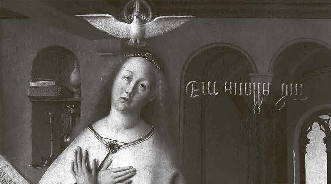 Такая стилизация задавала направление взгляда – картину можно рассматривать и снизу, с нашей точки зрения, но и сверху, с божественной позиции взгляда, глядеть на нее из прошлого и из будущего. Универсальная фактурность имитации, драгоценная мнимая поверхность, созданная простым освоением пространства, позволяет, вернувшись от изнаночной стороны к лицевой, переноситься то в прошлое, то в будущее, воспарять на небеса. Вспомним, как в его «Благовещении» Гентского алтаря (1432) слова Мадонны «Се раба Господня» (Ecce ancilla Domini) написаны вверх ногами – их читает Святой Дух, но и зритель, причастный таинствам христианства. Лицевая сторона работает как машина времени и машина пространства – обретение ценностей на изнаночной стороне и есть обретение смыслов истории на лицевой. Современная фотография, которая, как показала культуролог Оксана Гавришина1, механизирует и руинированное, и неруинированное пространство с целью переопределения прошлого, настоящего и будущего как мест ощущения, координат сбывшегося бытия-присутствия, в этом смысле напрямую продолжает уроки ван Эйка.