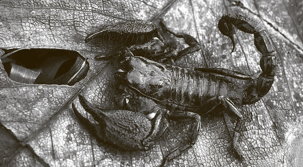 Впервые это удивительное создание из типа членистоногих, класса паукообразных Арахнид (Arachnida), я встретил в азиатских пустынях: сидящий под пучком пустынной травы желтый скорпион, увидев меня, растопырил свои клешни, поднял хвост и покачивал им, угрожая мне своим жалом на его конце. При том, что я был раз в 100 больше его, никакой робости он не испытывал и нагло шел на меня, как танк. Весь его облик и действия показывали, что он – настоящий воин! Даже когда он увидел перед собою черный глаз фотообъектива, он не отступил и не сбежал.