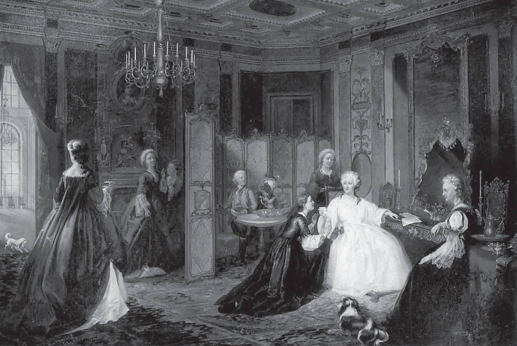 Екатерина II стала настоящим «работником» на троне: вставала в шесть-семь часов утра, работала с бумагами, слушала доклады секретарей. Ее утренний туалет занимал по меркам той эпохи очень мало времени – «никогда не долее часу». После завтрака по хорошей погоде она совершала прогулку с любимыми собачками. Далее чередой шли выходы, чтение документов, прием высших чиновников… Обычный (не парадный) обед в узком кругу изысканностью не отличался; любимым блюдом императрицы было мясо с огурцами. Запивалась еда клюквенным морсом, на десерт подавались яблоки и вишни. Екатерина почти не употребляла вина – разве что рюмку рейнвейна или мадеры. После обеда она читала и снова работала до шести часов вечера, когда опять шла гулять, играла в карты или посещала театр. В десять вечера императрица ложилась спать.