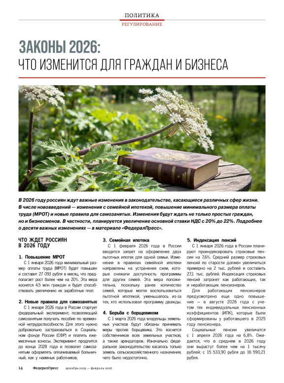 Журнал «Федерал Пресс» выходит в свет с 2012 года. Журнал посвящен людям, компаниям, регионам и их достижениям, которые меняют страну здесь и сейчас. Это актуальная социально-политическая и экономическая карта России, портрет страны для тех, кто хочет понимать, какие тренды, идеи и люди сегодня в авангарде.